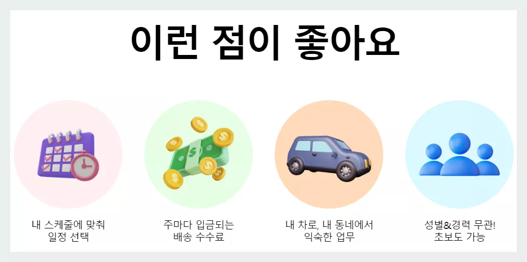 - 일반 승용차: 소형 물품 배송이 가능하며, 화물운송종사 자격증 없이도 참여할 수 있습니다.